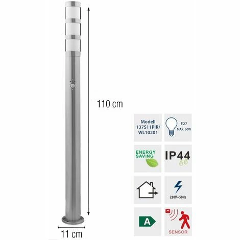 Weitere Vorteile sind die Höhe von 110 cm, die Leistung bis 60 Watt, die Eignung für LED-Leuchtmittel und der Bewegungsmelder.