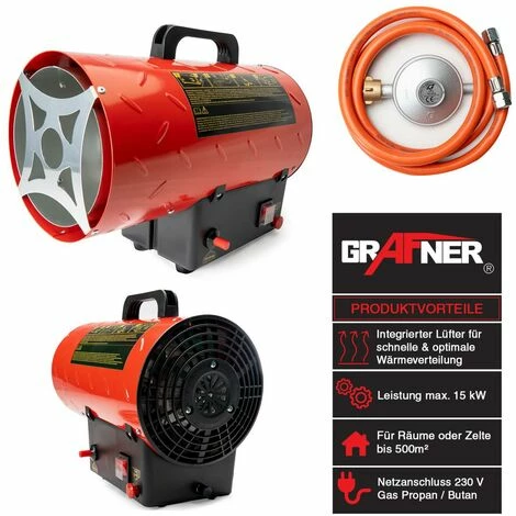 • Leistungsstark: Die Umgebungsluft wird durch den Turbo-Ventilator angesaugt, per Gasflamme erhitzt und durch das speziell geformte Ausblasgitter optimal verwirbelt ausgeblasen. Dadurch kann eine Raumgröße von max. 500m² beheizt werden. Somit garantiert der Heizlüfter auch an kalten Tagen ein angenehmes Arbeiten. Denn nur in wenigen Minuten ist der Arbeitsplatz angenehm warm.