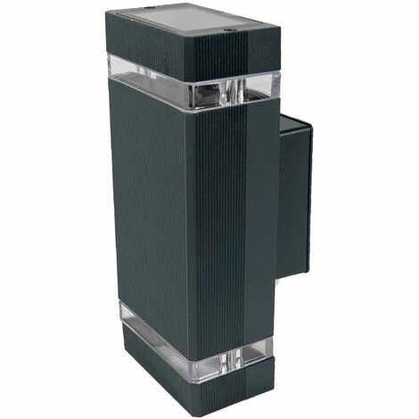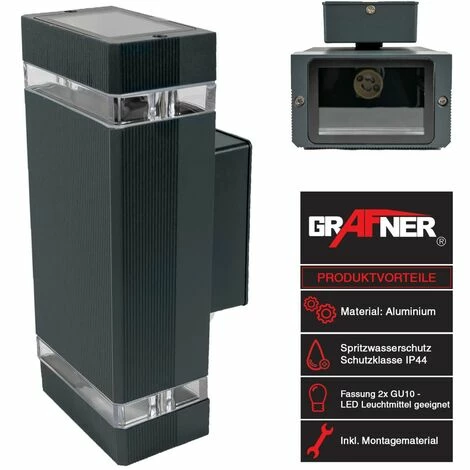 • DETAILS: Aus Aluminium gefertigt mit hochwertiger Pulverbeschichtung | Anschluss an 230V per in der Leuchte versenkbarer Verdrahtungsmöglichkeit | Farbe: Anthrazit / schwarz | Schutzklasse – IP44 spritzwassergeschützt | 2x GU10-Fassung (max. je 35 Watt) – für Leuchtmittel aller Art, Farbe und Größe geeignet (auch für smarte Leuchtmittel) | Lichtschein: nach oben und unten gerichtet | Maße: ca. Höhe 26 cm, Breite 11 cm, Tiefe 10 cm | Spannung: AC 220-240 V ~50 Hz