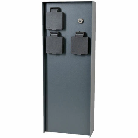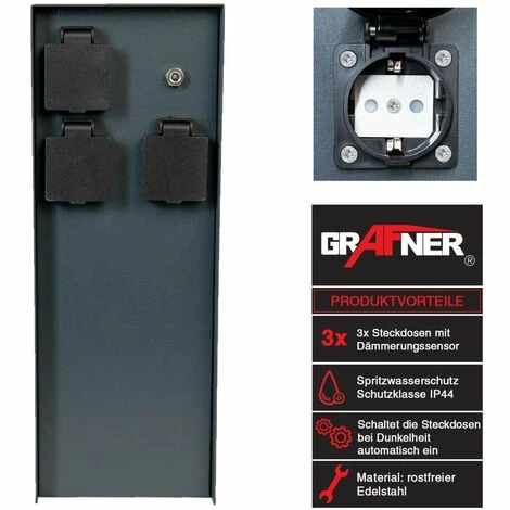 • DETAILS: Material: Edelstahl | Anschluss an 230V per in der Säule versenkbarer Verdrahtungsmöglichkeit | integrierter Dämmerungssensor (Helligkeitssensor) für vollautomatischen Betrieb | Anzahl Steckdosen: 3 | Farbe: Anthrazit | max. Belastung: 3600 Watt | hochwertige Pulver-Beschichtung | max. Belastung: 3600 Watt | Maße: Breite: ca. 14 cm, Tiefe: ca. 7 cm , Höhe: ca. 40 cm | Schutzklasse: IP44 |selbstschließende Klappdeckel | incl. Dübel und Schrauben zur schnellen Montage