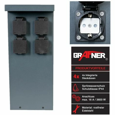 Endlose Kabelknäuel im Garten? Ständig müssen Sie Verlängerungskabel auf- und abrollen? Wir machen endlich Schluss damit! Unsere wetterfeste Edelstahl-Gartensteckdose der Marke Grafner verfügt über 4 Steckdosen, sodass diese für viele verschiedene Geräte wie z.B. Gartenpumpen, Hochdruckreiniger, Grills, Lichterketten, uvm. genutzt werden kann. Das schlichte und kompakte Slim-Design fügt sich optimal in Ihre Gartenlandschaft und setzt trotzdem einen eleganten und wertigen Akzent. Durch die solide Ausführung aus Edelstahl und die Pulver-Beschichtung ist eine lange Lebensdauer garantiert – zudem schützen die praktischen Klappdeckel das Innere der Steckdose zuverlässig vor Feuchtigkeit und Verschmutzungen, sodass jederzeit ein sicherer Betrieb garantiert ist. Die in der Steckdose versenkbare Verdrahtungsmöglichkeit und das beigefügte Montagematerial ermöglichen eine schnelle und einfache Montage: Ob im Beet, auf der Terrasse oder auf dem Rasen.